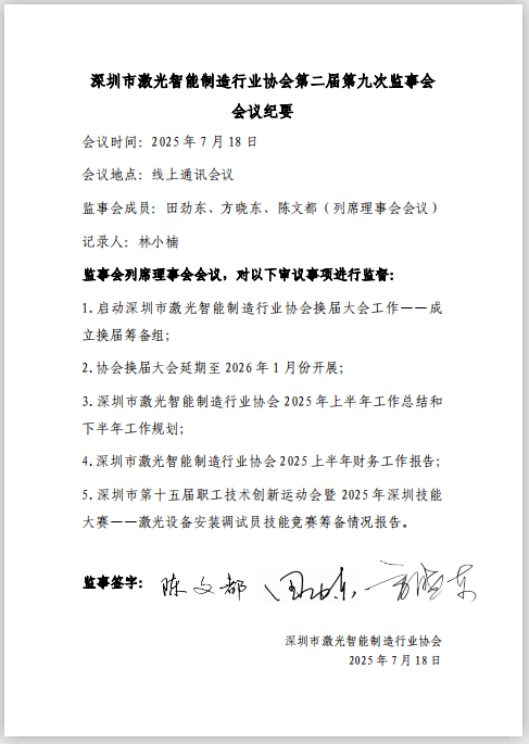 深圳市激光智能制造行业协会第二届第九次监事会会议纪要
