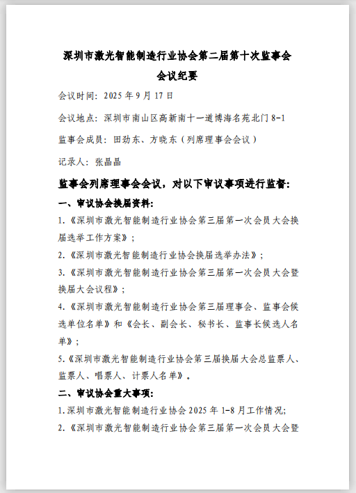 深圳市激光智能制造行业协会第二届第十次监事会会议纪要