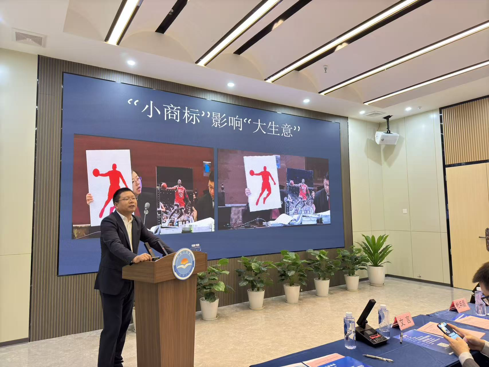 会场布置规范有序,大屏幕清晰展示活动主题与城市线描背景,演讲者从容专业,台下听众凝神静听,部分人员不时低头做笔记。摄像设备全程记录,体现出活动的权威性与传播价值。签到表显示,参会单位覆盖制造业、金融、保险、法律服务等多个领域,彰显活动跨行业影响力。